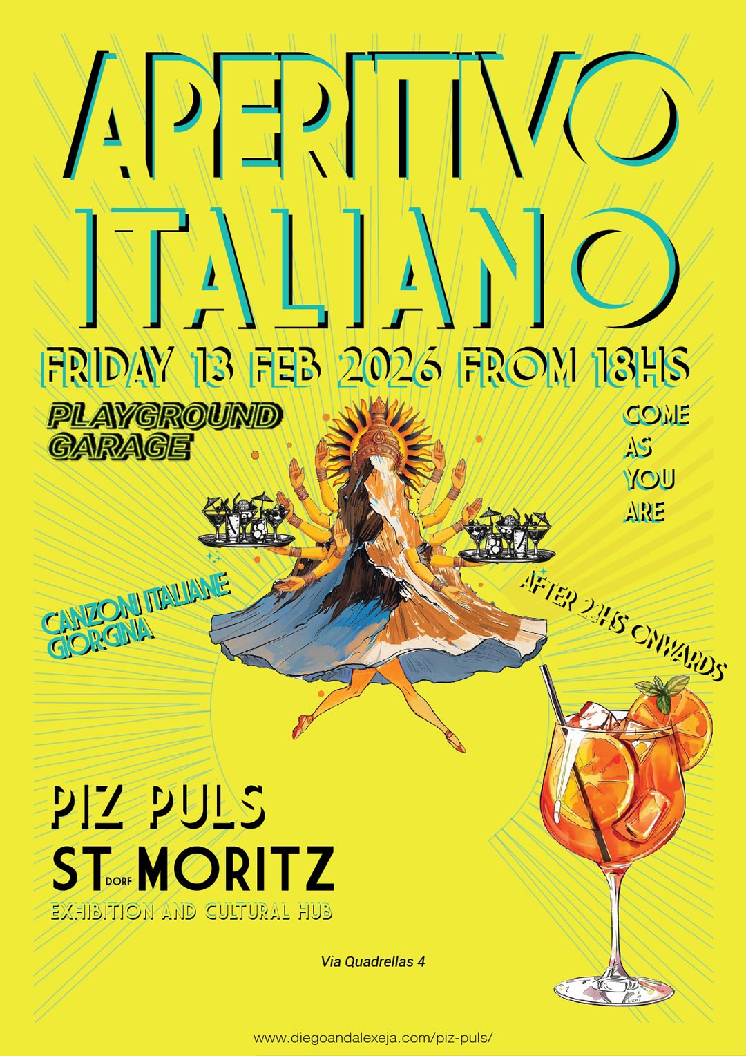 An Italian apero with a laid-back twist: Italian tunes selected by Giorgina set the mood, while a curated selection of classic Italian cocktails flows throughout the evening. Snacks and pica-pica from the Piz Puls all-day menu and daily specials complete the experience — a relaxed celebration of Italian flavors, sounds, and conviviality.